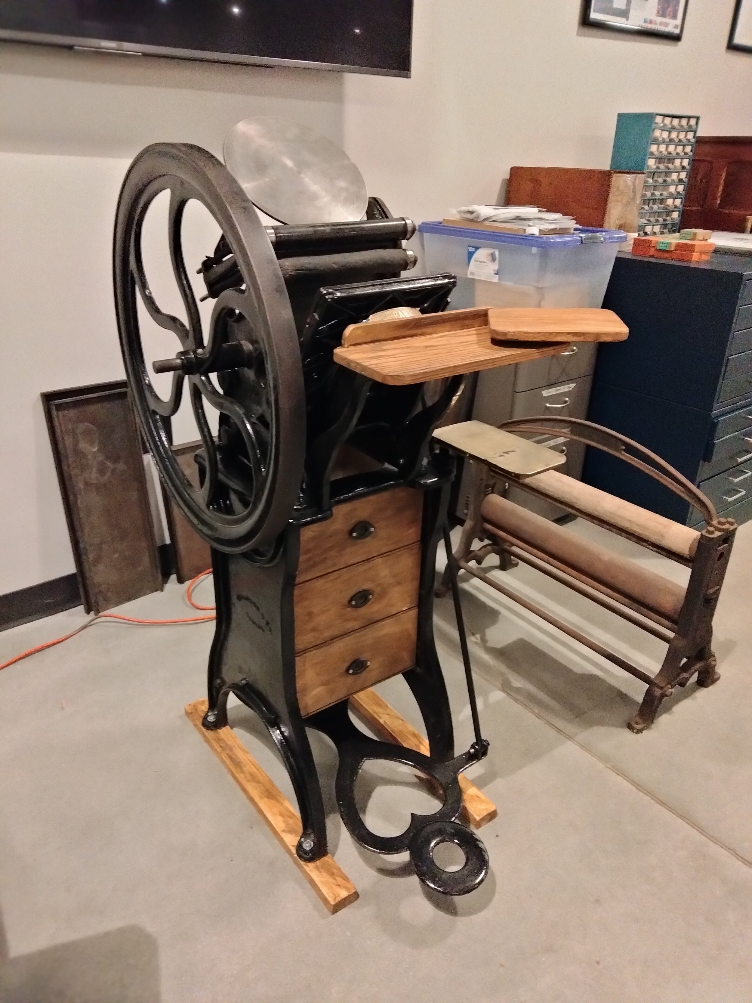 I first met Bruce at Craftsmen Printing as he was selling his business. Among the equipment he pointed out in the premises was an old Peerless platen treadle operated letterpress, patented in 1873. He told me that this was his first press, purchased with his newspaper route funds, before he started high school. It had a broken frame which I later repaired and added a motor with a modern speed controller. The Peerless was one of a number of presses I had the pleasure of working on from Bruce’s collection which is one of the most substantial private letterpress collections of printing equipment and letterpress type font in the Southeast.
