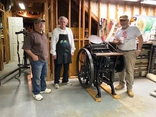 Top row: Bruce amd his Peerless press, other presses, shop view 1, shop view 2